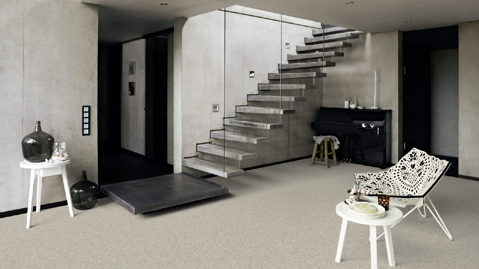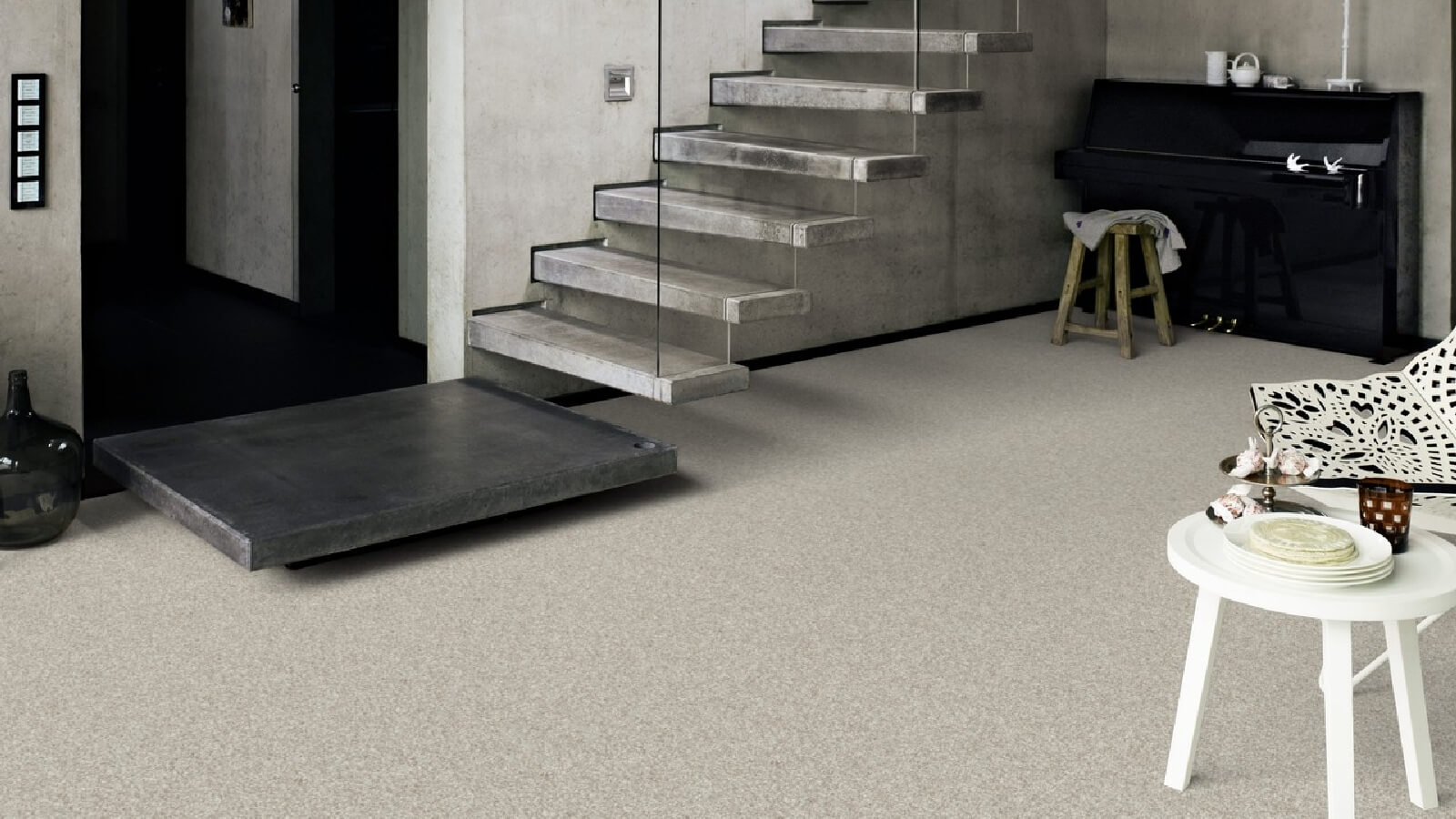 La surface finement nodulée et les couleurs ton sur ton créent un effet de détente dans la pièce.